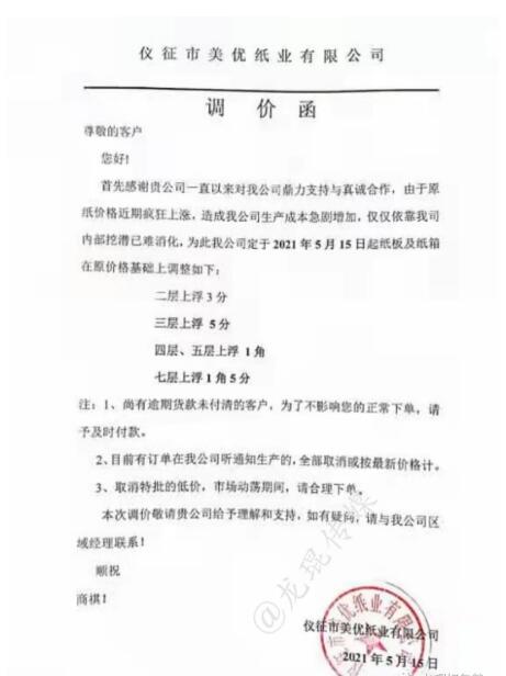 瀘州市一圣鴻包裝有限公司 從2021年5月17日起,按現執行價格上漲3%。  重慶協興包裝有限公司 從2021年5月17日起,板材現價格在執行價格基礎上上漲3%。