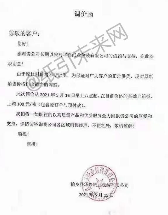 柏鄉(xiāng)縣華興紙業(yè)包裝有公司:由于原材料價格不斷上漲,此次調(diào)價從2021年5月16日早上八點(diǎn)起,在目前價格的基礎(chǔ)上箱板、上調(diào)100元/噸(包含原訂單與預(yù)付款)。