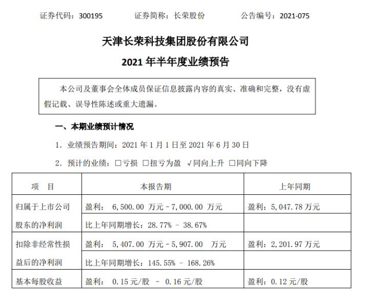 7月12日,長榮股份(300195)近日發(fā)布2021年半年度業(yè)績預(yù)告,預(yù)計(jì)業(yè)績同向上升。報(bào)告期內(nèi)歸屬于上市公司股東的凈利潤6,500.00萬元–7,000.00萬元,比上年同期增長28.77%-38.67%;基本每股收益0.15元/股–0.16元/股。