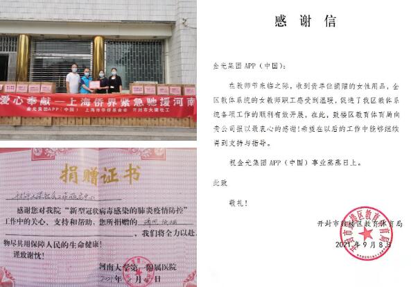 在2021年教師節(jié)來臨之際,金光集團更是協(xié)調(diào)部分物資,給開封市一線基層女教師送去節(jié)日的問候。 在此次河南暴雨災(zāi)情中,金光集團已向受暴雨災(zāi)情影響的鄭州、新鄭、鶴壁等地輸送物資十批,共計24卡車?购榫葹(zāi)前期主要為洪水汛情緊急的?h、新鄭、新鄉(xiāng)等地30多個居民安置點和100多個受災(zāi)村鎮(zhèn)的農(nóng)戶提供衛(wèi)生生活物資,受益人數(shù)超過10萬人。暴雨災(zāi)情緩解后,陸續(xù)為鄭州、新鄉(xiāng)、鶴壁等地的醫(yī)院、學(xué)校、基層社區(qū)衛(wèi)生單位的一線醫(yī)護人員、社區(qū)工作人員和老師、學(xué)生3萬余人提供衛(wèi)生物資…… 念念不忘,必有回響。金光也不斷收獲著來自四面八方發(fā)來的感謝信。一方有難,八方支援,當災(zāi)難來臨的時候,人們渴望的是有一雙手,有一盞燈。而金光,就是那盞狂風驟雨里搖曳不滅的燈。