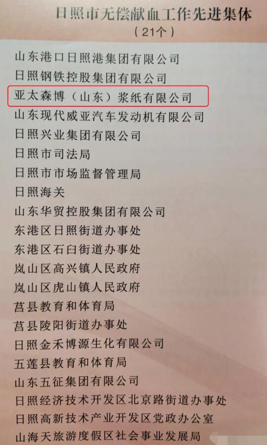頒獎典禮上,日照市衛健委、市委宣傳部、市直機關工委、團市委、市教育局、市紅十字會六部門共同授予亞太森博(山東)漿紙有限公司“日照市無償獻血工作先進集體”榮譽稱號,副市長林彥芹出席并頒獎。