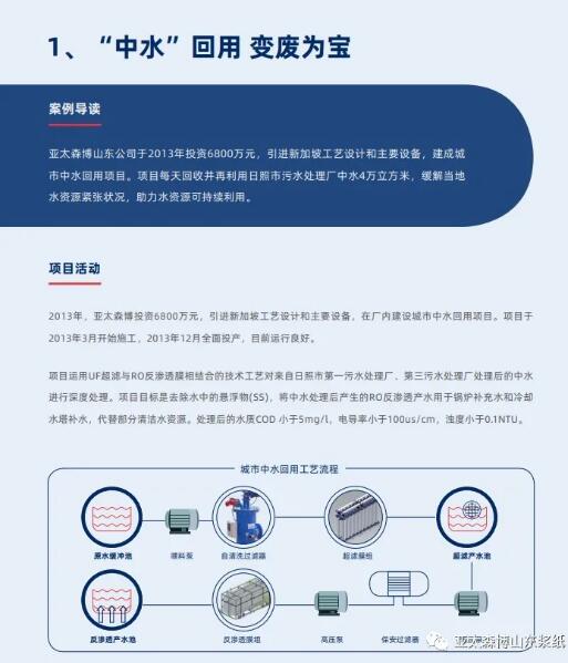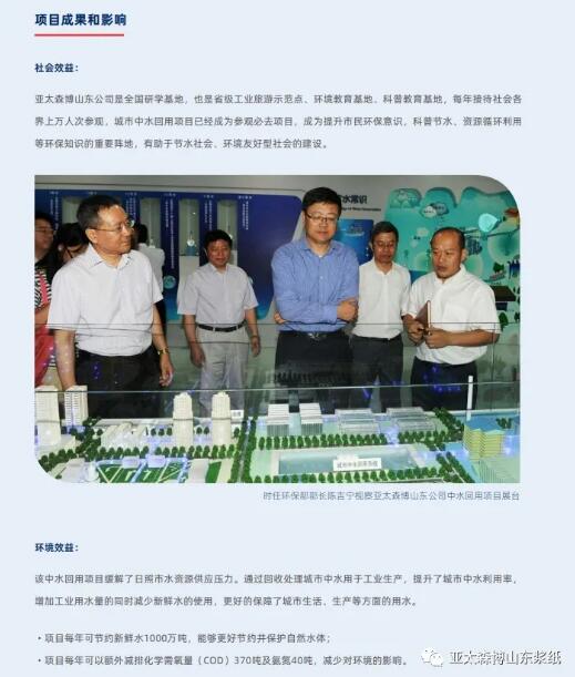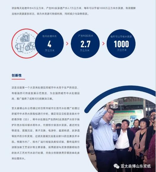 項(xiàng)目成果和影響 社會(huì)效益: 亞太森博山東公司是全國(guó)研學(xué)基地,也是省級(jí)工業(yè)旅游示范點(diǎn)、環(huán)境教育基地、科普教育基地,每年接待社會(huì)各界上萬人次參觀,城市中水回用項(xiàng)目已經(jīng)成為參觀必去項(xiàng)目,成為提升市民環(huán)保意識(shí),科普節(jié)水、資源循環(huán)利用等環(huán)保知識(shí)的重要陣地,有助于節(jié)水社會(huì)、環(huán)境友好型社會(huì)的建設(shè)。 環(huán)境效益: 該中水回用項(xiàng)目緩解了日照市水資源供應(yīng)壓力。通過回收處理城市中水用于工業(yè)生產(chǎn),提升了城市中水利用率,增加工業(yè)用水量的同時(shí)減少新鮮水的使用,更好的保障了城市生活、生產(chǎn)等方面的用水。 ·項(xiàng)目每年可節(jié)約新鮮水1000萬噸,能夠更好節(jié)約并保護(hù)自然水體; ·項(xiàng)目每年可以額外減排化學(xué)需氧量(COD)370噸及氨氮40噸,減少對(duì)環(huán)境的影響。 經(jīng)濟(jì)效益: 除鹽水、軟化水及工藝水是紙漿廠的主要用水。此前,工廠一直使用湖水處理成清水,再制為上述三類水用于生產(chǎn)。建設(shè)中水回用項(xiàng)目后,工廠使用成本更低的中水,通過超濾反滲透設(shè)備過濾獲得RO反滲透產(chǎn)水,RO反滲透產(chǎn)水再制為除鹽水、軟化水及工藝水。相較而言,湖水成本高,處理成上述三種水的處理成本也高。而中水成本很低,RO反滲透產(chǎn)水處理成上述三種水的成本也很低。總體而言,該項(xiàng)目每年可為工廠節(jié)省運(yùn)行費(fèi)用約1000萬元。 外部認(rèn)可 ·2014年,項(xiàng)目入選“金蜜蜂企業(yè)社會(huì)責(zé)任中國(guó)榜”和2014年《WTO經(jīng)濟(jì)導(dǎo)刊》全國(guó)外商投資企業(yè)最佳社會(huì)責(zé)任案例; ·2015年,項(xiàng)目入選國(guó)家環(huán)保宣教示范項(xiàng)目,并在國(guó)家環(huán)保宣教基地進(jìn)行展示推廣,得到原環(huán)保部部長(zhǎng)陳吉寧、山東省相關(guān)領(lǐng)導(dǎo)、水利部相關(guān)領(lǐng)導(dǎo)以及德國(guó)國(guó)際合作機(jī)構(gòu)(GIZ)有關(guān)專家的高度評(píng)價(jià); ·2016年,項(xiàng)目獲復(fù)旦大學(xué)“αi價(jià)值共創(chuàng)”中國(guó)企業(yè)社會(huì)責(zé)任卓越案例評(píng)選—“價(jià)值共創(chuàng)”踐行獎(jiǎng); ·2017年,項(xiàng)目入選德國(guó)國(guó)際合作機(jī)構(gòu)(GIZ)可持續(xù)發(fā)展投資回報(bào)(SROI)全球最佳案例。