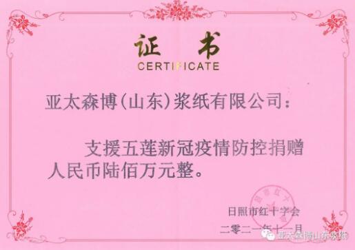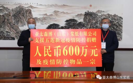 11月2日上午,亞太森博(山東)漿紙有限公司助力五蓮縣疫情防控捐贈儀式在日照市政府舉行。副市長高月波主持捐贈活動,并為公司頒發(fā)了捐贈證書。公司董事長、總經(jīng)理陳小榮代表企業(yè)向五蓮縣捐贈600萬元人民幣及疫情防控物品一宗,強力支援新冠疫情防控。