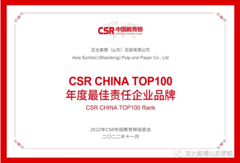 11月10日,第六屆CSR中國教育榜正式發布。亞太森博(山東)漿紙有限公司憑借在教育領域的卓越貢獻,榮獲“CSR CHINA TOP 100 年度最佳責任企業品牌”獎項。