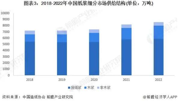 ——廢紙漿占70%左右 從中國紙漿細分市場供給結構來看,2018-2022年,廢紙漿供給量均位列第一,占總產量比例呈逐年下降趨勢,從76%下降至69%。2022年,廢紙漿供給量達到5914萬噸,較上年增加100萬噸。