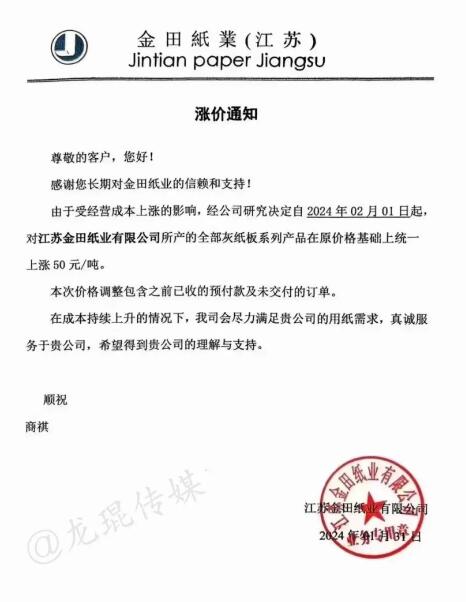 1月31日,金田紙業(yè)發(fā)布了最新的灰板紙漲價(jià)函。
