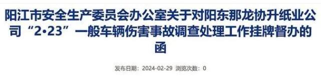 陽江市安全生產(chǎn)委員會辦公室關于對陽東那龍協(xié)升紙業(yè)公司“2·23”一般車輛傷害事故調查處理工作掛牌督辦的函