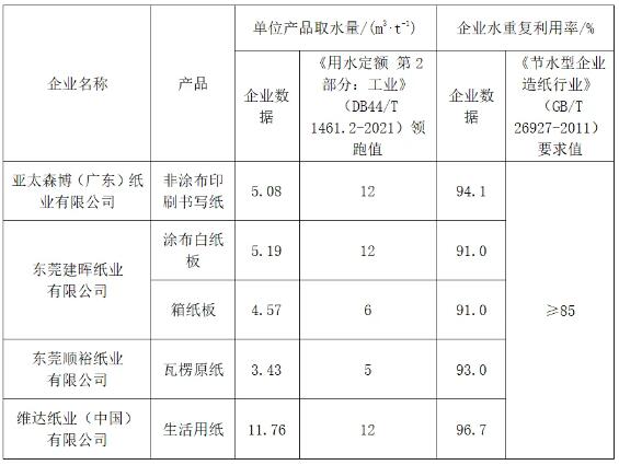 2023年12月,廣東省工業和信息化廳公布2023年廣東省重點行業“能效(水效)領跑者”名單,其中造紙行業4家企業5個產品被評為廣東省造紙行業“能效領跑者”,4家企業5個產品被評為廣東省造紙行業“水效領跑者”。具體情況如表3和表4所示。 表32023年廣東省造紙行業“能效領跑者”名單