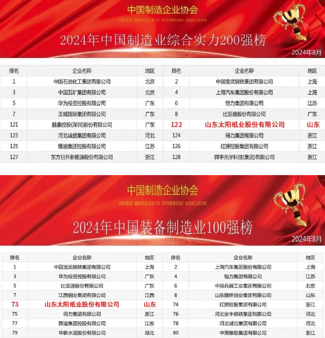 近日,中國制造企業協會對外發布《2024中國制造業綜合實力200強暨中國裝備制造業百強》榜單。其中,太陽紙業憑借出眾的創新能力和出色的業績表現,再次入圍2024中國制造業綜合實力200強榜單,位列第122位,較去年上升12個位次;并同時入圍2024中國裝備制造業百強榜單,位列第73位。