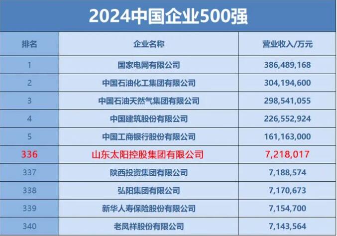 9月11日,在2024中國500強企業高峰論壇上,中國企業聯合會、中國企業家協會發布“2024中國企業500強”榜單。其中,公司控股股東山東太陽控股集團有限公司位列“2024中國企業500強”第336位,彰顯了太陽控股培育和發展新質生產力、推進綠色低碳高質量發展的杰出成效。