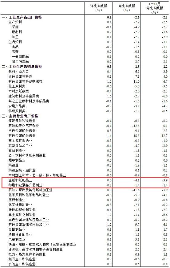 二、11月份工業(yè)生產(chǎn)者價格環(huán)比變動情況 工業(yè)生產(chǎn)者出廠價格中,生產(chǎn)資料價格上漲0.1%,影響工業(yè)生產(chǎn)者出廠價格總水平上漲約0.10個百分點,生活資料價格持平。 值得關(guān)注的是,2024年11月份印刷和記錄媒介復制業(yè)工業(yè)生產(chǎn)者出廠價格同比下降了1.4%,1—11月印刷和記錄媒介復制業(yè)工業(yè)生產(chǎn)者出廠價格同比下降1.4%。 2024年11月份造紙和紙制品業(yè)工業(yè)生產(chǎn)者出廠價格同比下降了4.1%,1—11月造紙和紙制品業(yè)工業(yè)生產(chǎn)者出廠價格同比下降3.9%。 2024年11月工業(yè)生產(chǎn)者價格主要數(shù)據(jù)