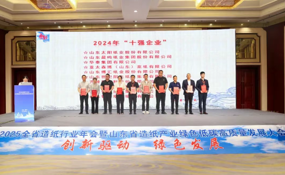 2025年5月8日-9日,以“創(chuàng)新驅(qū)動(dòng)、綠色發(fā)展”為主題的“2025山東省造紙行業(yè)年會(huì)暨山東省造紙產(chǎn)業(yè)綠色低碳高質(zhì)量發(fā)展大會(huì)”在山東德州成功召開。會(huì)上,中國(guó)造紙協(xié)會(huì)副理事長(zhǎng)、山東省造紙行業(yè)協(xié)會(huì)專職副會(huì)長(zhǎng)趙振東宣讀了《山東協(xié)會(huì)認(rèn)定“雙十”標(biāo)桿企業(yè)——山東省造紙行業(yè)協(xié)會(huì)“2024年‘十強(qiáng)企業(yè)’‘十佳企業(yè)’”通報(bào)》,其中,山東太陽(yáng)紙業(yè)股份有限公司被認(rèn)定為“2024年‘十強(qiáng)企業(yè)’”。