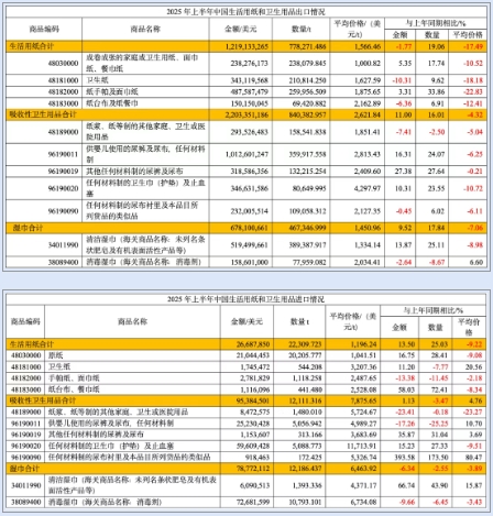 生活用紙 出口 2025年上半年,生活用紙出口量77.83萬t,較2024年同期增長19.06%,出口金額12.19億美元,較2024年同期下降1.77%,呈現量增價跌的趨勢。出口產品仍以成品為主,2025年上半年成品占總出口量的69.41%(2024年上半年為69.06%),較2024年同期有所增長。成品紙中手帕紙、面巾紙出口量增長最快,為33.86%。 進口 2025年上半年,生活用紙總進口量比2024年同期有所增長,但進口量很少,只有2.23萬t;進口產品中仍然以原紙為主,占總進口量的90.57%。 吸收性衛生用品 出口 2025年上半年,吸收性衛生用品的總出口量為84.04萬t,出口金額為22.03億美元,均保持雙位數增長,分別增長16.01%和11.00%。出口產品中仍以嬰兒紙尿褲為主,占出口總量的42.83%,嬰兒紙尿褲出口量為35.99萬t,同比增長24.07%。 其中,寵物墊、護理墊等衛生用品出口對應的商品編碼48189000(紙漿、紙等制的其他家庭、衛生或醫院用品)下的產品出口量,2025年上半年較2024年同期減少4.068.60t,為近年來首次下降,分析原因是美國加征關稅對我國二季度出口帶來一定的影響,該編碼下產品出口目的地排名第一的美國的出口量2025年上半年較2024年同期減少5.184.61t。