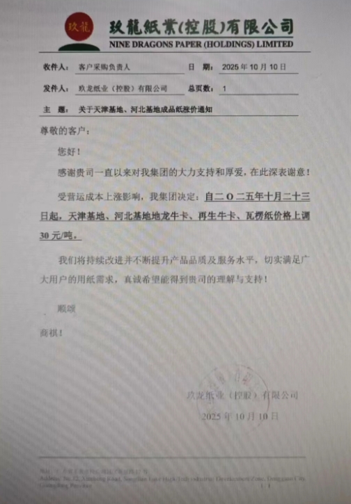 自十月二十日起,泉州基地所有牛卡、瓦楞紙價格上調RMB30元/噸。