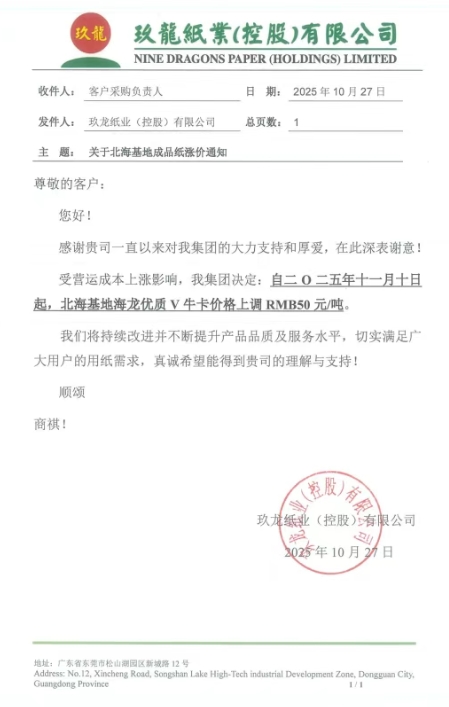 • 玖龍太倉基地 自十一月七日起,太倉基地地龍優質牛卡、地龍牛卡價格上調50元/噸。