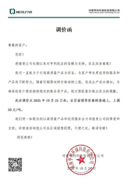 隨著玖龍、山鷹等龍頭紙企率先上調原紙價格,新一輪漲價潮已拉開序幕。各地紙企緊隨其后,陸續發布調價函,漲價壓力正逐步向下游傳導。 • 玖龍泉州基地 自十一月三日起,泉州基地所有?ā⑼呃慵垉r格上調 RMB 50 元/噸。