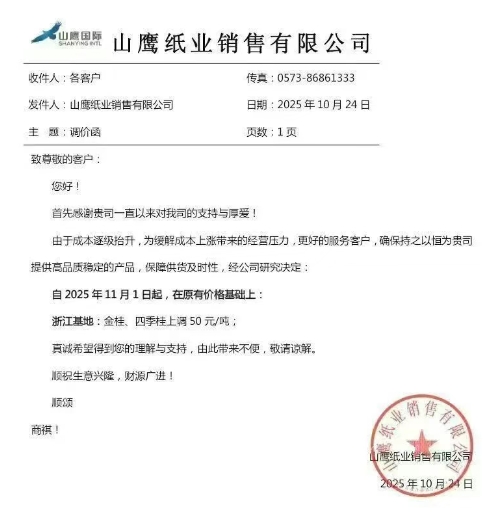 • 山鷹浙江基地 自11月1日起,在原有價格基礎上: 浙江基地:金桂、四季桂上調 50 元/噸。