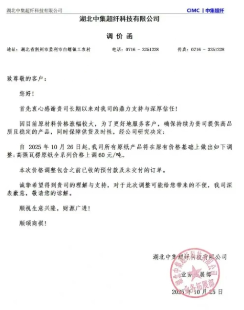 • 湖北中集超纖科技有限公司 自10月26日起,我司所有原紙產品將在原有價格基礎上做出如下調整:高強瓦楞原紙全系列價格上調60元/噸。