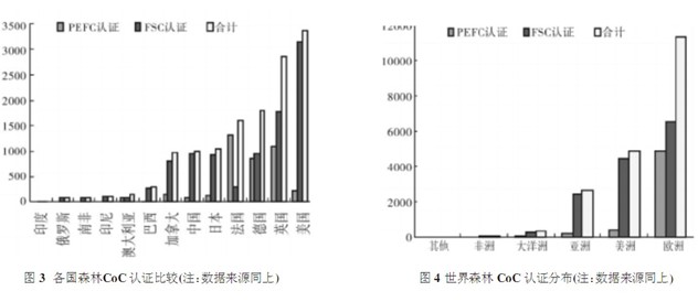 監(jiān)管鏈認(rèn)證是指對森林產(chǎn)品從源頭到加工與分布配置的所有過程進(jìn)行跟蹤。當(dāng)前,世界上由不同認(rèn)證體系認(rèn)證的森林產(chǎn)品監(jiān)管鏈的企業(yè)超過2萬家。到2009年6月15日,由FSC認(rèn)證體系認(rèn)證的企業(yè)數(shù)為13706家;到2009年7月31日,由PEFC認(rèn)證體系認(rèn)證的企業(yè)數(shù)為5578家。然而,由FSC認(rèn)證的企業(yè)數(shù)分布在世界不同地區(qū)的96個(gè)國家,而由PEFC認(rèn)證的企業(yè)數(shù)主要分布在歐美等地區(qū)的46個(gè)國家,無論是認(rèn)證數(shù)量還是地理分布都有一定的差距。